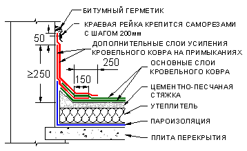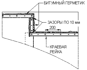 При монтаже необходимо выдерживать расстояние в 5-10мм между краевыми рейками. Во всех местах, где дополнительные слои усиления кровельного ковра заканчиваются, установите краевую рейку вертикально. После установки краевой рейки уложите битумный герметик в зазор между верхним отгибом и стеной. Вертикально установленную краевую рейку обрабатывают битумным герметиком с двух сторон (см. рис. 22). В кровлях с парапетной стеной из бетонных панелей, в местах стыка бетонных панелей рейка разрезается. Сверху устанавливается фартук из оцинкованной стали, перекрывающий место разрыва. Фартук крепится саморезами с одной из сторон и промазывается полиуретановым или тиоколовым герметиком для межпанельных швов (см. рис. 23).