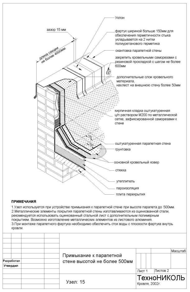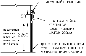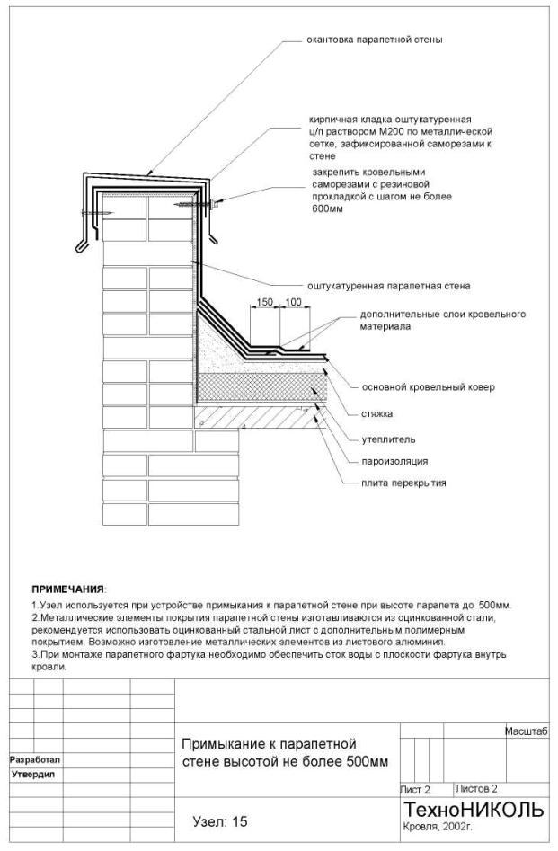 Примыкание к парапетной стене высотой менее 500 мм (проекция) |