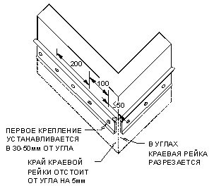 В краевой рейке пробиты отверстия с шагом 100 мм. Верхняя кромка рейки имеет отгиб, обеспечивающий герметизацию шва между металлической рейкой и плоскостью стены. Рейка монтируется на гладкие вертикальные поверхности (оштукатуренные кирпичные стены, монолитный бетон, бетонные плиты). Краевая рейка не может устанавливаться на деревянные поверхности и металлические фартуки. В местах внутренних или внешних углов краевая рейка режется. Изгибать рейку в углах нельзя. Край краевой рейки должен крепиться на расстоянии не более 50 мм от угла кровли (см. рис. 21). В местах углов расстояние между первым и вторым саморезами (считая от угла) 100 мм, все последующие саморезы устанавливаются с шагом 200 мм.