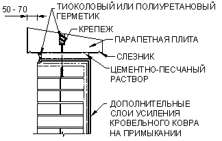 Рис. 27 Примыкание кровельного ковра к парапетной стене с парапетным камнем. Стыки парапетных плит необходимо герметизировать тиоколовым (полисульфидным) или полиуретановым герметиком.