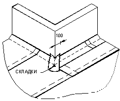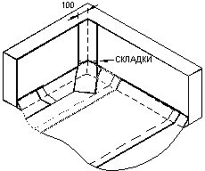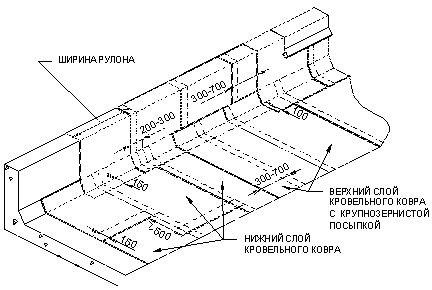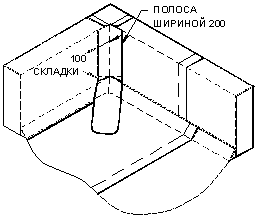 Рис. 28. Раскладка полотнищ рулонного материала на примыканиях к парапету. Заводить материал на парапетные стены, высотой до 1 м можно, дополнительно фиксируя полотнища кровельного материала к парапетной стене через 500 мм (см. рис. 29). Сверху парапетная стена должна также закрываться фартуком из оцинкованной стали или парапетной плитой.