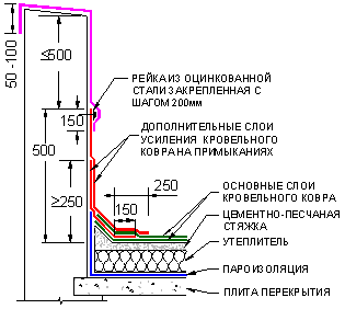 Рис. 25 Закрепление края кровельного ковра на кирпичной стене. При невозможности оштукатурить кирпичную стену целиком и отсутствии «выдры» в примыкании кровельного ковра к кирпичной стене, в стене прорезают штрабу под установку отлива. Ниже штрабы стену оштукатуривают цементно-песчаным раствором М150. Дополнительные слои усиления кровельного ковра на примыкании заводят на высоту не менее 300 мм и край фиксируют краевой рейкой. Отлив из оцинкованной стали должен заходить в штрабу не менее чем на 50 мм и сверху промазан полиуретановым или полисульфидным (тиоколовым) герметиком. 4.7.2.4. Примыкание к парапетной стене высотой менее 500 мм. При высоте парапетной стены менее 500 мм, дополнительные слои кровельного ковра заводят на парапетную стену (см. рис. 26, 27). Верхний дополнительный слой должен заходить на фасадную часть здания на 50-100мм (см. рис. 26).