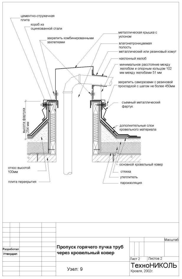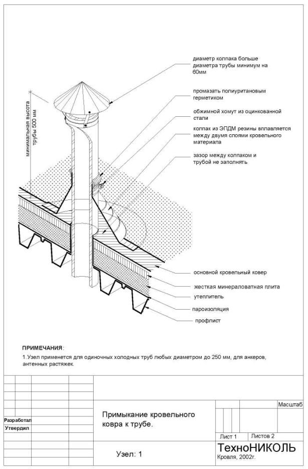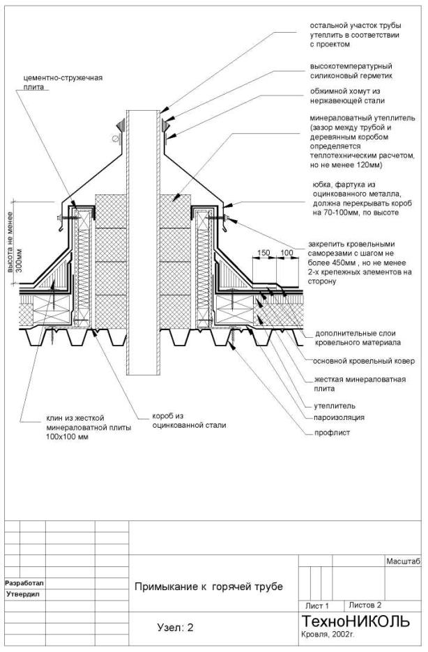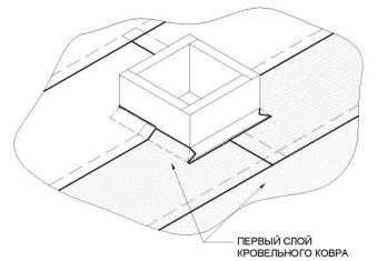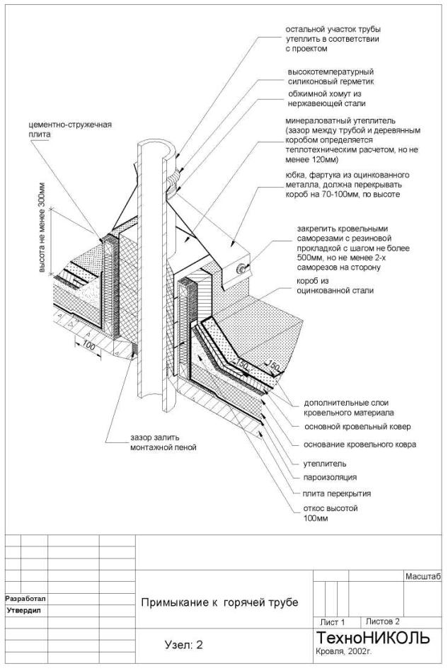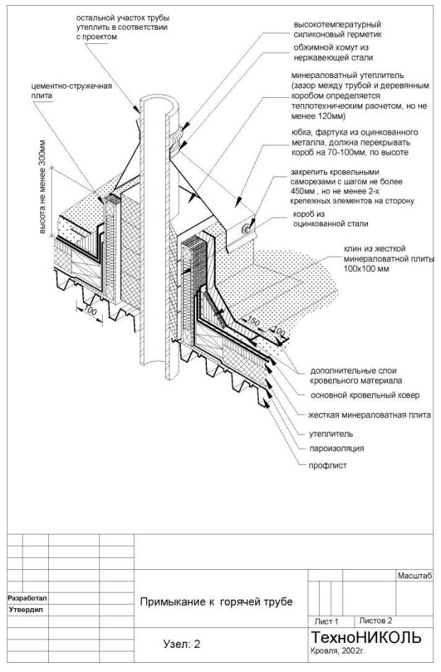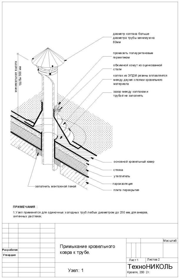 Примыкание кровельного ковра к горячей трубе (проекция) |