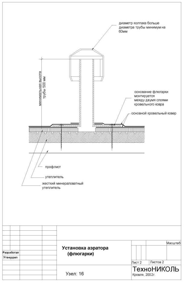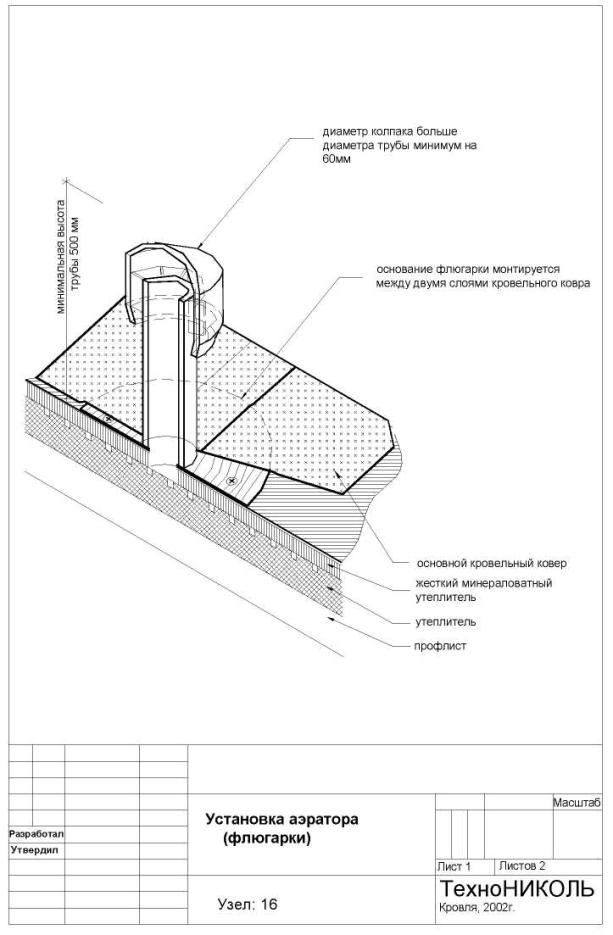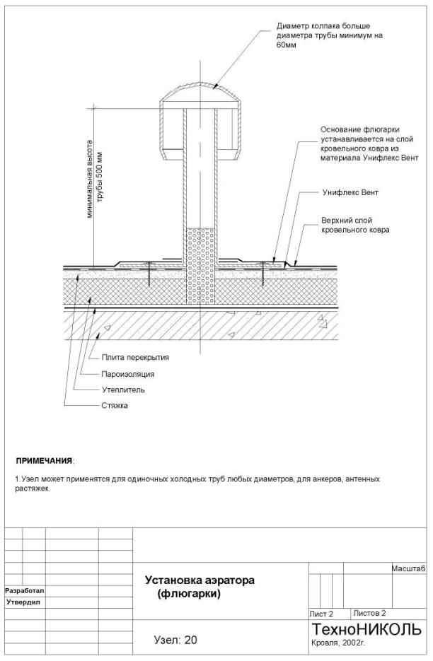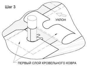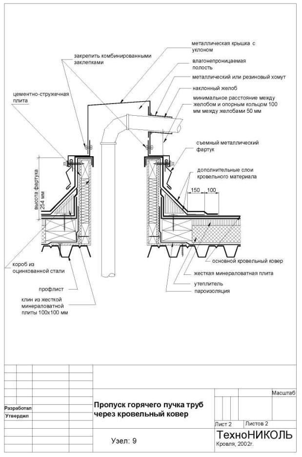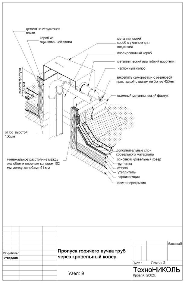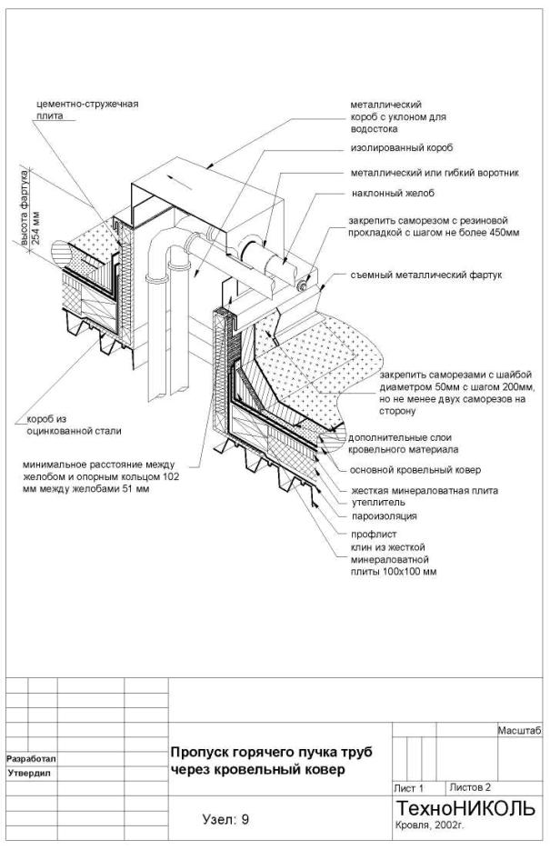 Примыкание кровельного ковра к горячей трубе (проекция) |