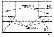 Рис. 9. Раскрой и расположение теплоизоляционных плит в непрямых углах кровли. 4.3.5. Плиты утеплителя могут быть склеены между собой горячим битумом или битумной мастикой. Склеивание должно быть равномерным и составлять не менее 30% от площади склеиваемых поверхностей. 4.3.6. Промокший во время монтажа минераловатный утеплитель должен быть удален и заменен сухим. 4.4. Устройство основания под водоизоляционный ковер.4.4.1. Во вновь устраиваемых цементно-песчаных стяжках выполняют температурно-усадочные швы шириной около 5 мм, разделяющие стяжку на участки не более чем 6×6 м, стяжки из асфальтобетона делят на карты 4×4 м. Швы должны совпадать с торцевыми швами несущих плит и располагаться над швами в монолитной теплоизоляции. 4.4.2. Свежеуложенные цементно-песчаные стяжки могут быть огрунтованы битумным праймером. Огрунтовку производят через 3-4 часа после укладки цементно-песчаной стяжки. Праймер готовят, вливая горячий битум в керосин в соотношениях 1:2-1:3. 4.4.3. Допускается наличие на основании под укладку кровельного ковра плавно нарастающих неровностей не более 10 мм поперек уклона и не более 5 мм вдоль уклона. Количество неровностей должно быть не более двух на 4 м2 площади основания. Проверка ровности основания осуществляется контрольной 2-х метровой рейкой. Для оснований из штучных материалов неровности поперек и вдоль уклона не должны превышать 10 мм. 4.4.4. Воронки внутренних водостоков должны быть установлены согласно проекту в пониженных местах кровли с механическим креплением их к конструкциям здания. 4.4.5. В местах примыкания к стенам, парапетам, вентиляционным шахтам и другим кровельным конструкциям выполнить наклонные бортики под углом 45º и высотой 100 мм из цементно-песчаного раствора или асфальтобетона. 4.4.6. Вертикальные поверхности конструкций, выступающих над кровлей и выполненных из штучных материалов (кирпича, пенобетонных блоков и т.д.), необходимо оштукатурить цементно-песчаным раствором М150 на высоту подъема дополнительного водоизоляционного ковра, не менее чем на 350 мм. 4.5. Подготовительные работы перед укладкой кровельного ковра.4.5.1. Качественная укладка битумных материалов при температуре ниже +5ºC может быть обеспечена только при работе в “тепляках”. После хранения или транспортировки материалов при отрицательной температуре, битумные рулонные материалы необходимо отогреть до температуры не менее +15ºС. Это позволит избежать потери посыпки при разворачивании рулона материала. Вода, попавшая между слоями кровельного материала и замерзшая там, при разворачивании рулона может содрать посыпку. 4.5.2. Перед устройством водоизоляционного ковра произвести подготовительные работы: · основание очистить от пыли, мусора, посторонних предметов (в зимнее время - от наледи и снега); · удалить кровельный ковер (при капитальном ремонте); · заделать раствором раковины, трещины, неровности. 4.5.3. После получения кровельных материалов необходимо провести проверку качества применяемых материалов на соответствие ТУ. 4.5.4. Проверить влажность основания. Влажность цементно-песчаных стяжек не должна превышать 4% по массе, а стяжек из асфальтобетона - 2,5%. 4.5.5. К устройству водоизоляционного ковра приступают после составления и подписания акта на скрытые работы. 4.5.6. Водоизоляционный ковер выполняется по проекту, где указывается наимено