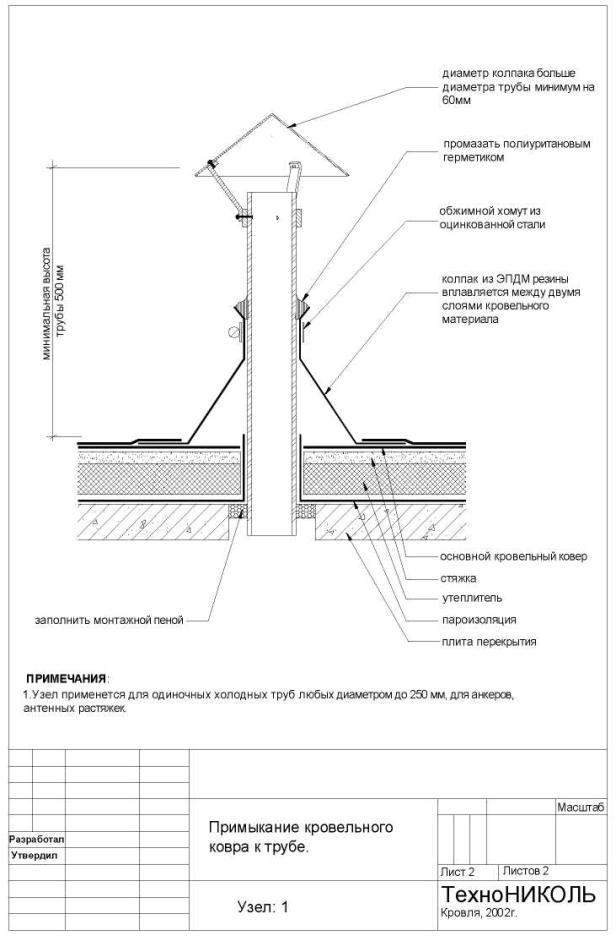 4.8.2. Сопряжение кровельного ковра с круглыми стальными трубами диаметром от 100 мм. Данный способ изготовления примыкания кровельного ковра не применим к пластиковым трубам, пучкам трубок и для горячих труб.