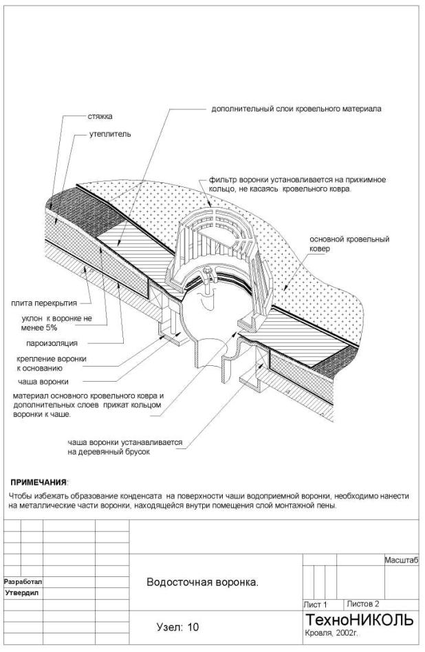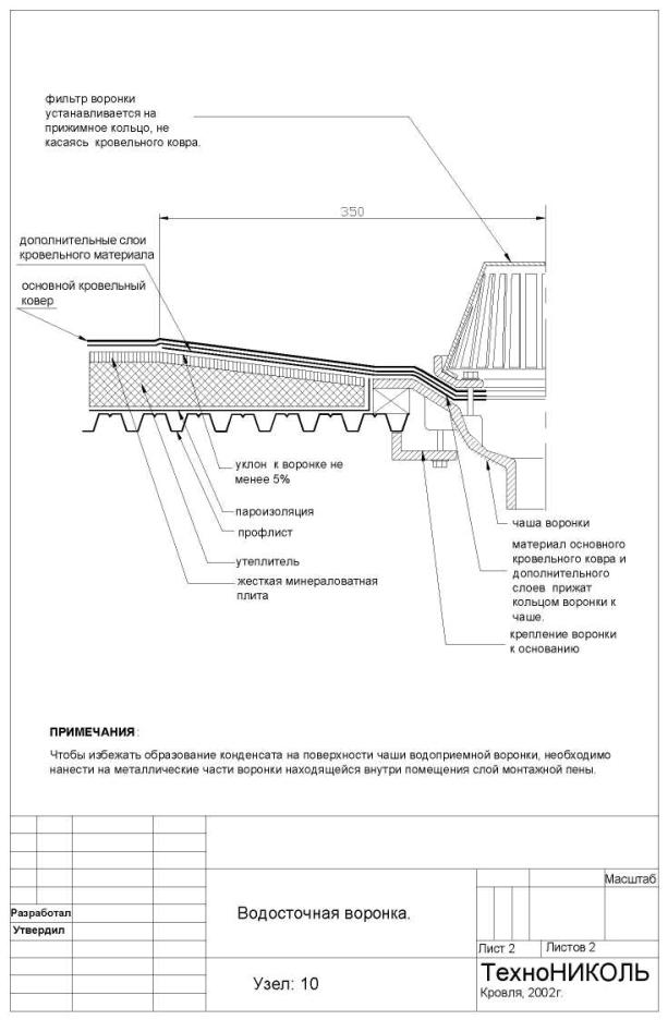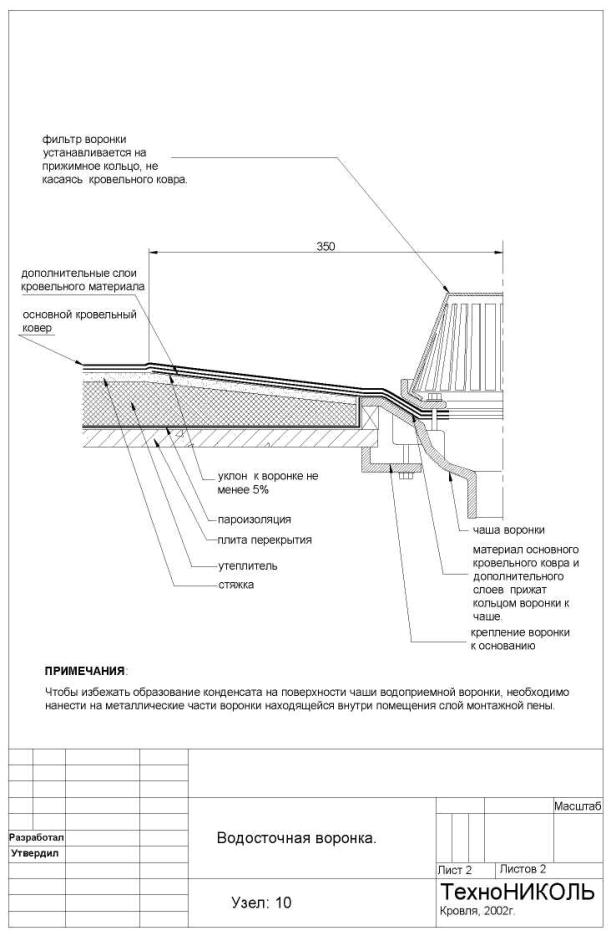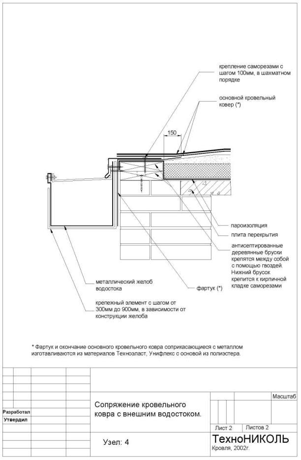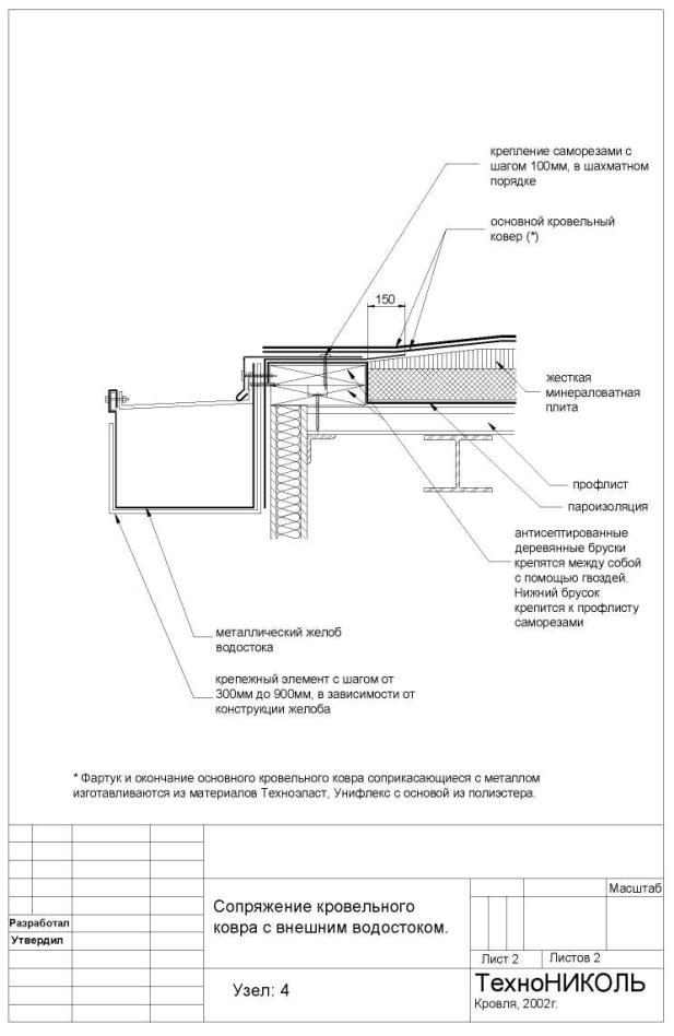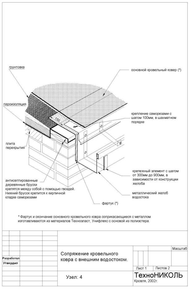 Сопряжение кровельного ковра с внешним водостоком (проекция) |