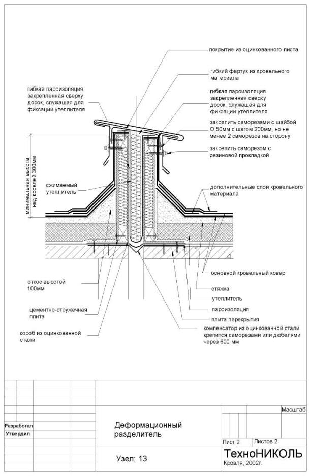 Рис. 5. Деформационный шов. 3.7.2. ТДШ со стенками из легкого бетона или штучных материалов может устанавливаться в кровлях с бетонным основанием или с основанием из ж/б плит. 3.7.3. Стенки ТДШ устанавливается на несущие конструкции. Край стенки ТДШ должен быть выше поверхности кровельного ковра на 300 мм. Шов между стенками должен быть не меньше 30 мм. 3.7.4. Металлический компенсатор, устанавливаемый в ТДШ, не может служить пароизоляцией. Необходима укладка дополнительных слоев пароизоляционного материала на компенсатор. 3.8. Воронки внутреннего водостока.3.8.1. Площадь кровли, приходящаяся на одну воронку, и диаметр воронки должны устанавливаться из расчета с учетом норм проектирования соответствующих зданий и требований строительных норм по проектированию канализации и водостоков зданий. 3.8.2. Водоприемные воронки внутреннего водостока должны располагаться равномерно по площади кровли на пониженных участках преимущественно вдоль каждого ряда разбивочных осей здания. 3.8.3. На каждом участке кровли, ограниченном стенами, парапетом или деформационными швами, должно быть не менее двух воронок. 3.8.4. Местное понижение кровли в местах установки воронок внутреннего водоотвода должно составлять 20 - 30 мм в радиусе 500 мм за счет уменьшения толщины слоя утеплителя или за счет основания под водоизоляционный ковер. 3.8.5. Водоприемные воронки, расположенные вдоль парапетов, других выступающих частей зданий должны находиться от них на расстоянии не менее 450 мм. Не допускается установка водосточных стояков внутри стен. 3.8.6. Водоотводящее устройство не должно менять своего положения при деформации основания кровельного ковра или прогибе несущего основания кровли. Чаши водосточных воронок должны быть прикреплены к несущему основанию кровли и соединены со стояками через компенсаторы.