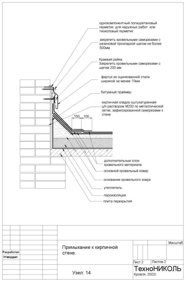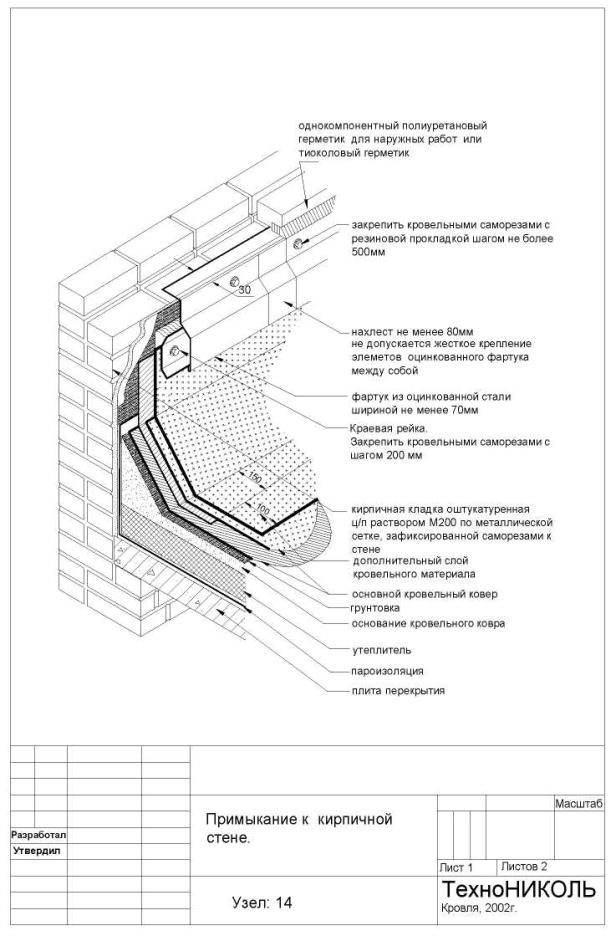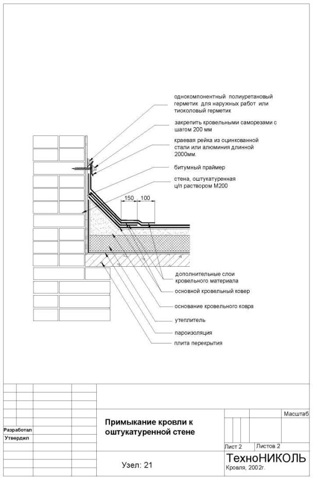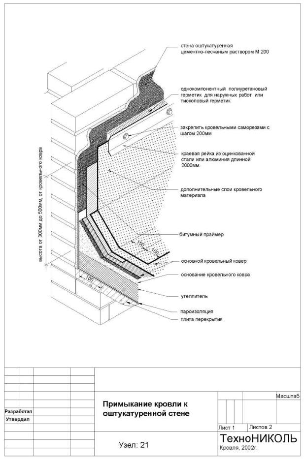 Примыкание кровли к оштукатуренной стене (проекция) |