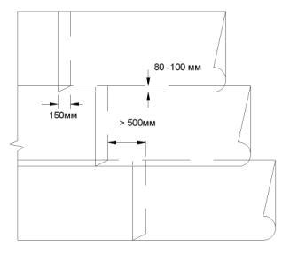 Рис. 2 Порядок укладки гидроизоляционного материала. 5.3.4. Допускается поперечная раскатка рулонов в пределах тротуаров с расположением нахлестки рулонов материала в поперечном направлении с учетом продольного уклона так, чтобы верхний рулон был наклеен с повышенного места, как показано на рис. 2. 5.3.5. Перед укладкой гидроизоляции рекомендуется развернуть 5-6 рулонов, примерить каждый рулон по отношению к другому, обеспечив нахлест по продольным кромкам. Затем приклеить концы всех рулонов с одной стороны и снова скатать материалы в рулоны. Для удобства работы и обеспечения качества рулоны должны быть круглыми. Плоский рулон материала следует раскатать на ровной поверхности и скатать его с другого края. 5.3.6. При работе в условиях отрицательных температур воздуха для исключения повреждения материала при раскатке его необходимо выдержать в теплом помещении до положительной температуры. 5.3.7. Полотна рулонных гидроизоляционных материалов наклеивают внахлестку на 80-100мм по продольным сторонам и не менее 150 мм в поперечных стыках смежных рулонов (Рис. 3), в продольном направлении пролетного строения поперечные стыки рулонов в смежных полосах должны быть сдвинуты относительно друг друга на 500 мм.