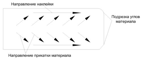 Рис. 3 Соединение полотен гидроизоляционного материала. 5.3.8. Угловые участки наклеенных материалов, оставляемые при перерывах в работе, должны быть особенно тщательно приклеены во избежание затекания воды под них. Рекомендуется подрезать углы материала по радиусу или диагонали, чтобы увеличить длину катета шва, следовательно уменьшить вероятность непроплава и прохода воды через место нахлеста (Рис. 4). 5.3.9. Особое внимание уделяют нахлестам материалов. Для достижения лучшей приклейки в местах нахлестов материал прикатывают валиками или мягкими щетками, движения которых должны быть в направлении приклейки (Рис. 4).