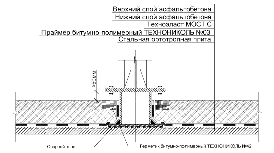 Рис. 6 Гидроизоляция у стойки барьерного ограждения. 5.4.7. Гидроизоляция у стоек барьерного ограждения должна обеспечить отвод воды от основания стоек. 5.4.8.В местах примыкания гидроизоляции к конструкции деформационного шва материал Техноэласт МОСТ С наклеивают на горизонтальную полку окаймления. Сопряжение асфальтобетонной одежды с вертикальной частью деформационного шва производится через слой герметика битумно-полимерного ТЕХНОНИКОЛЬ № 42 (Рис. 7).