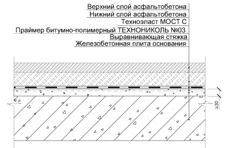 Рис. 9 Конструкция дорожной одежды на железобетонной плите. 6.1.2. Выравнивающий слой может быть выполнен переменной толщины для придания поверхности под гидроизоляцию необходимого уклона, либо может отсутствовать при монолитной плите проезжей части, поверхность которой удовлетворяет требованиям выполнения гидроизоляции в соответствии с п.п. 6.2. 6.1.3. На сборных пролетных строениях с бетонируемыми стыками устройство выравнивающего слоя обязательно. 6.1.4. Выравнивающий слой выполняют из мелкозернистого (песчаного) бетона, имеющий класс по прочности на сжатие не ниже В25 по ГОСТ 26633-91*, марку по водонепроницаемости не ниже W6 по ГОСТ 12730.5-84* и марку по морозостойкости F 300 по ГОСТ 10060.0-95 с водоцементным отношением не выше 0,42. 6.1.5. В бетонную смесь для выравнивающего слоя необходимо вводить пластифицирующие и воздухововлекающие добавки в соответствии с СНиП 3.06.04-91. Введение химических добавок-ускорителей твердения и противоморозных - не допускается. Применение для выравнивающего слоя керамзитобетона и других легких бетонов не допускается. 6.1.6. В технологических целях, для обеспечения защиты бетонной поверхности от насыщения влагой, увеличения прочности сцепления наплавляемого гидроизоляционного материала с основанием, поверхность подготовленного бетонного основания грунтуется праймером битумно-полимерным ТехноНИКОЛЬ № 03 (п.п. 3.3.). 6.1.7. Гидроизоляцию железобетонной плиты проезжей части выполняют из битумно-полимерного рулонного наплавляемого гидроизоляционного материала Техноэласт МОСТ С (п.п. 3.2.). Физико-механические характеристики материала приведены в Таблице 4 настоящих Рекомендаций. 6.1.8. Перед укладкой асфальтобетонного покрытия необходимо произвести нивелировку проезжей части, составить картограмму отметок с шагом 5×5 м и по ним определить толщины покрытия по всей поверхности проезжей части. 6.1.9. Отклонение толщины покрытия от проектных в меньшую сторону в пределах ширины проезжей части не допускается. 6.1.10. Укладка асфальтобетонного покрытия производится непосредственно на гидроизоляцию. В том числе, допускается укладка литых асфальтобетонных смесей с температурой до 220°C. 6.1.11. В пределах служебных проходов и тротуаров конструкция дорожной одежды аналогична конструкции дорожной одежды на проезжей части. Толщина асфальтобетонного покрытия принимается по проектам. 6.2. Подготовка поверхности основания гидроизолируемой железобетонной плиты.6.2.1. Гидроизолируемая поверхность должна иметь продольные и поперечные уклоны, соответствующие требованиям п. 1.74 СНиП 2.05.03-84*: продольный в соответствии с продольным профилем сооружения, поперечный - не менее 20 %. Допускается уменьшение поперечного уклона при условии, что суммарный векторный уклон составляет не менее 20 %. 6.2.2. Гидроизолируемая поверхность не должна иметь раковин, наплывов бетона, трещин, неровностей с острогранными кромками, масляных пятен, пыли. Масляные пятна удаляют выжиганием, наплывы бетона срубают с последующей шлифовкой. 6.2.3. Гидроизолируемая поверхность должна быть ровной и соответствовать классу шероховатости 2-Ш, при котором допускается суммарная площадь отдельных раковин и углублений не более 3 мм до 0,2 % на 1м2 при расстоянии между выступами с впадинами 1,2-2,5 мм (СНиП 3.04.03-85 табл. 2 и 3). 6.2.4. При наличии на гидроизолируемой поверхности отдельных неровно