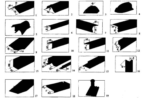 1 - планка; 2 - планка конька на профиль Монтеррей; 3 - конец на коньковую планку; 4 - конец на коньковую планку для шатровой крыши; 5 - планка формы «У» для конца шатровой крыши; 6 - торцевая планка 50×50 мм; 7 - торцевая планка 103×115 мм; 8 - карнизная планка; 9 - планка для внутренних швов и стыков; 10 - планка для наружных углов; 11 - планка для внутренних углов; 12 - планка с внутренним и наружным углами; 13 - планка для швов и стыков; 14 - снегозадержатель; 15 - верхняя планка; 16 - боковая планка; 17 - планка для разжелобки; 18 - лист для покрытия наружных углублений; 19 - выходная труба Рисунок 1 - Комплектующие детали кровли из металлочерепицы Крыши с кровлями из металлочерепицы, для обустройства которых может быть использован данный проект, приведены на рисунке 2.