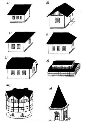 а - односкатная; б - двускатная; в - шатровая; г - четырехскатная; д - получетырехскатная; е - двускатная с фонарем; ж - многоскатная; з - шпилеобразная Рисунок 2 - Крыши с кровлями из металлочерепицы Односкатная крыша опирается своей несущей конструкцией (системой стропил) на наружные стены, находящиеся на разных уровнях (рисунок 2, а). Двускатная крыша состоит из двух плоскостей, опирающихся на стены, расположенные на одном уровне (рисунок 2, б). Шатровая крыша имеет четыре треугольных ската, вершины которых сходятся в одной точке (рисунок 2, в). Четырехскатная крыша образуется от соединения двух трапециевидных скатов и двух треугольных торцовых скатов (рисунок 2, г). Получетырехскатная крыша имеет срезанные вершины над торцовыми стенами в виде треугольников (рисунок 2, д). Двускатная крыша промышленного здания с продольным фонарем (рисунок 2, е). Многоскатная крыша образуется от соединения многоугольных, чаще всего треугольных, плоскостей (рисунок 2, ж). Шпилеобразная крыша состоит из нескольких крутопадающих треугольных скатов, сомкнутых к вершине (рисунок 2, з). Проект производства работ может быть использован также при строительстве здания с мансардой, потолок и часть стен которой являются одновременно кровлей здания. Данный проект производства работ разработан на обустройство кровли для здания с размером в плане 6,0×10,0 м и высотой до конька 9,0 м. Форма крыши - многоскатная, из пяти плоскостей. Уклон кровли составляет 100 % (45°), объем кровельных работ - 92 м2 кровли. В качестве основания под кровлю из металлочерепицы принята обрешетка из антисептированных досок. Другие характеристики кровли заданы: количество ендов - 2 шт. (по 4,0 м каждая), общая длина конька - 13,0 м, общая длина карниза - 14,0 м, общая длина торца здания - 25,0 м, влажность во внутреннем пространстве здания - повышенная (от 70 до 76 %). В составе проекта производства работ предусматриваются: - устройство основания под кровлю; - монтаж листов металлочерепицы; - монтаж других комплектующих деталей кровли. Основанием под кровлю из металлочерепицы может служить также металлическая или комбинированная с деревянной обрешетка, выполняемая из прокатного профиля, досок (бруса) или их комбинации. При ремонте (реконструкции) кровли обрешетка может быть устроена без демонтажа кровли из рулонных, мастичных и других материалов. При этом должен быть произведен расчет несущей способности старого основания под кровлю на дополнительные нагрузки, возникающие при устройстве новой обрешетки и кровли из металлочерепицы. При разработке проекта использованы рекомендации МДС 12-33, а также нормативные и методические документы, основные из которых приведены в разделе 3. 3. НОРМАТИВНЫЕ И МЕТОДИЧЕСКИЕ ДОКУМЕНТЫВ настоящей работе использованы ссылки на следующие документы: СНиП 3.04.01-87. Изоляционные и отделочные покрытия СНиП 12-03-2001. Безопасность труда в строительстве. Часть 1. Общие требования СНиП 12-04-2002. Безопасность труда в строительстве. Часть 2. Строительное производство ГОСТ 12.1.019-79. ССБТ. Электробезопасность. Общие требования ГОСТ 12.1.046-85. ССБТ. Строительство. Нормы освещения строительных площадок ГОСТ 12.3.040-86. ССБТ. Строительство. Работы кровельные и гидроизоляционные. Требования безопасности ГОСТ 12.4.011-89. ССБТ. Средства защиты работающих. Общие требования и классификация ГОСТ 12.4.059-89. ССБТ. Строительство. Огр