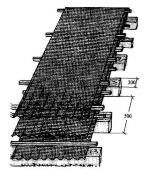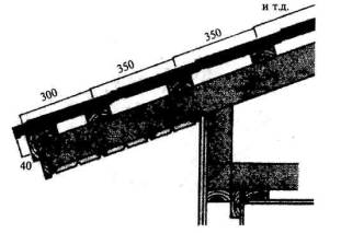 Рисунок 4 - Строповка металлочерепицы Для уменьшения опасной зоны при подъеме и перемещении листов металлочерепицы и других длинномерных деталей следует предусмотреть использование двух страховочных приспособлений (оттяжек) длиной 6 м и диаметром 12 мм, обеспечивающих наименьший габарит и предотвращающих их вращение. 4.1.5. Строительная площадка ограждается инвентарными средствами высотой не менее 1,6 м, выставляются предупредительные знаки опасности. Появление посторонних в зоне производства работ должно быть исключено. Для каждого конкретного объекта работ составляется план организации строительной площадки. 4.2. Основные работы4.2.1. Работы производятся в следующей последовательности: - устройство основания под кровлю; - укладка листов металлочерепицы; - монтаж комплектующих деталей кровли. Для выполнения кровельных работ предусматривается применение стандартных средств подмащивания, комплектов ручных машин и инструмента. Устройство основания под кровлю 4.2.2. Основание под кровлю (стропила и обрешетка) может быть выполнено из металлических и деревянных профилей. Устройство стропил и обрешетки производится по проекту. Перед укладкой листов металлочерепицы следует произвести обмер скатов с контролем плоскостности и перпендикулярности их линиям конька и карнизов. 4.2.3. Обрешетка из деревянных профилей выполняется из антисептированных досок, как правило, сечением 32×100 мм при шаге стропил 700-900 мм. Расстояние от крайней обрешетины - 300 мм, последующие расстояния между осями - 350 мм (рисунок 5).
