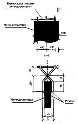 Рисунок 3 - Хранение металлочерепицы Не допускается хранение металлочерепицы вместе с агрессивными химическими продуктами. Грузоподъемные операции с упакованной металлочерепицей производятся с использованием текстильных ленточных строп, исключающих повреждение металлочерепицы. 4.1.3. Выполняются подготовка и комплектация деталей металлочерепичной кровли для бесперебойного выполнения кровельных работ. Проверяется, согласно сертификатам, техническим условиям и стандартам качество кровельных материалов: листов и деталей металлочерепицы, утеплителя, антиконденсатной пленки. 4.1.4. Подготавливаются к работе стреловой кран (башенный кран, строительный подъемник и т.п.) и съемное грузозахватное приспособление для подачи к рабочему месту деталей кровли. Для листов металлочерепицы готовят в качестве съемного грузозахватного приспособления траверсу ТР4 конструкции ОАО «НИПИ Промстальконструкция» (рисунок 4).