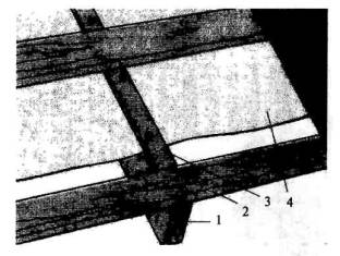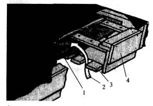 1 - устройство для задержания снега; 2 - металлочерепица; 3 - обрешетка; 4 - стропило Рисунок 17 - Крепление устройства для задержания снега 4.2.21. Крышевые лестницы крепят к обрешетке винтами сквозь лист металлочерепицы. Крепление лестницы показано на рисунке 18.