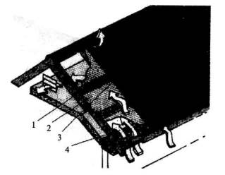 1 - обрешетка; 2 - антиконденсатная пленка; 3 - металлочерепица; 4 - движение воздуха Рисунок 7 - Движение воздуха от карниза к коньку
