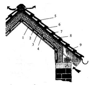 1 - потолок; 2 - рейки; 3 - паронепроницаемая пленка; 4 - теплоизоляция; 5 - металлочерепица; 6 - обрешетка; 7 - планка; 8 - антиконденсатная пленка; 9 - стропило Рисунок 9 - Устройство паронепроницаемой пленки 4.2.7. Доски на торцевых участках и доски ребристой обшивки, выходящие на карнизы, должны быть выше обрешетки на высоту профильного листа (рисунок 10).