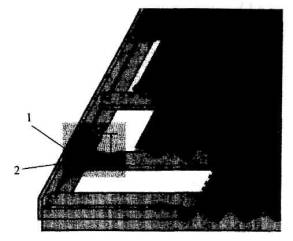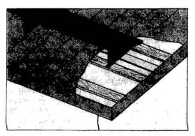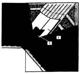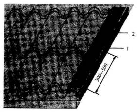 1 - лист гладкий; 2 - планка ендовы Рисунок 14 - Устройство ендовы 4.2.17. Торцевая планка устанавливается по шнуру и крепится самонарезающими винтами с шагом 200-300 мм к деревянному основанию. Планка покрывает торец поверх волны профиля (рисунок 15).