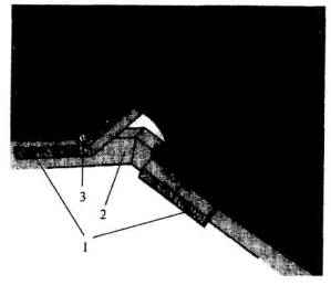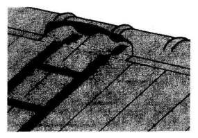 1 - дополнительные доски; 2 - стропила; 3 - уплотнительный профиль Рисунок 11 - Укладка дополнительных досок на коньке Укладка листов металлочерепицы4.2.8. Монтаж листов металлочерепицы начинают с торцевых участков на двускатной крыше, а на шатровой крыше листы устанавливают и крепят с торцов самой высокой точки ската по обе стороны. При длине ската более 6 м его укрывают двумя листами с нахлестом 150 мм. Листы металлочерепицы укладывают на обрешетку так, чтобы их края выступали наружу не более чем на 40 мм, иначе возможна деформация листа. 4.2.9. Укладку листов начинают с левого или правого торца. Если укладку начинают с левого торца, то следующий лист укладывают под последнюю волну предыдущего листа. Край листа устанавливают по карнизу с выступом на 40 мм. 4.2.10. Капиллярную канавку каждого листа, которая находится на волне левого края, накрывают следующим листом. Закрепление листов над капиллярными канавками в местах нахлестки показано на рисунке 12.