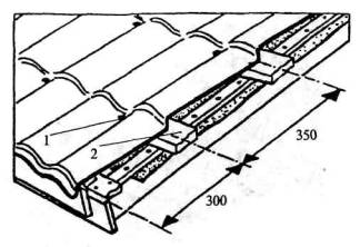 1 - планка; 2 - стена Рисунок 16 - Устройство примыкания к стене 4.2.20. Над входом в здание (и в других необходимых местах) на расстоянии около 350 мм от карниза под второй поперечной складкой металлочерепицы закрепляют к обрешетке самонарезающими винтами устройство для задержания снега (рисунок 17).