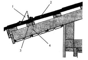 1 - стропило; 2 - обрешетка; 3 - планка; 4 - пленка Рисунок 6 - Укладка антиконденсатной пленки Обрешетку укладывают сверху на планки (закрепленные на стропилах) так, чтобы обеспечивалась вентиляция под кровельными листами (между пленкой и металлочерепицей) и предотвращалось выделение конденсата на внутренней стороне листа металлочерепицы. 4.2.5. Для надежной вентиляции подкровельного пространства создают зазоры таким образом, чтобы струя холодного воздуха беспрепятственно могла пройти от карниза к коньку (рисунки 7, 8).