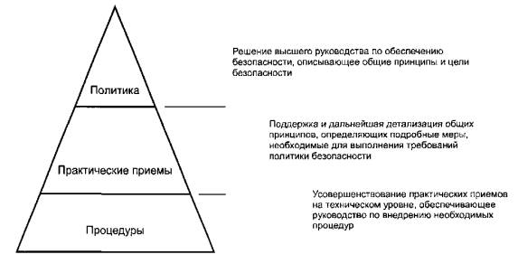 Рисунок 1 - Документация программы В документах, относящихся к информационной безопасности, должны быть охвачены как высокоуровневые цели организации, так и конкретные, относящиеся к безопасности, настройке устройств, реализующих политику. Диапазон охвата целей лучше всего представить множественными уровнями документации. Число уровней должно быть сведено к минимуму, и настоящий стандарт рекомендует использование трех уровней: документация о политике, документация практических приемов обеспечения безопасности и документация операционных эксплуатационных процедур безопасности. По мере внедрения в конкретной организации новой прогрессивной технологии потребуются дополнительные документы. В то время как документация политики обычно представляется на одной странице, документация процедур может состоять из нескольких многостраничных документов, представляющих отдельные специфические условия, организационные единицы и вопросы политики в организации. В некоторых случаях отдельная, вполне самостоятельная система может также иметь собственную документацию практических приемов. Все практические приемы и процедуры должны переходить с более высокого уровня на детальный уровень, поддерживая согласованность с оценками риска организации с общей политикой. 5.4.1.2 Политика информационной безопасности организации Документ политики является наименьшим по объему из всех документов в иерархии документов программы обеспечения информационной безопасности. Обычно политика состоит из нескольких параграфов, объясняющих, что руководство рассматривает информацию в любой форме как ценный ресурс организации, который нуждается в защите. Политика должна быть широкой по масштабу и сформулированной, как можно более просто и сжато, предоставлять конкретную информацию об активах, нуждающихся в защите, например данные о клиентах, сотрудниках, партнерские соглашения и процессы. Очень простой документ политика безопасности может содержать следующее единственное утверждение: «Конфиденциальность, доступность и целостность всех информационных активов организации должны быть обеспечены посредством соответствующих защитных мер». Политика безопасности - это документ, всеобъемлющий по своему масштабу и являющийся наиболее важной частью программы информационной безопасности организации, которая влияет на ее работу. Должен существовать только единственный вариант документации политики в конкретный момент, который должен быть доведен до сведения всех сотрудников организации. Данный вариант должен быть подписан членами правления организаций, имеющими отношение к информационной безопасности, например, руководителем организации и руководителем службы информационной безопасности. Документ политики безопасности должен быть открытым, широко распространенным и доступным всем заинтересованным сторонам организации. В документе необходимо подчеркнуть, что защита и обеспечение информационных активов являются обязанностью руководства и всех служащих и что обучение и обеспечение осведомленности в области безопасности поручено руководству на самом высоком уровне. Всем заинтересованным сторонам должно быть ясно, что документ политики вступает в силу при согласовании и утверждении его соответствующими должностными лицам