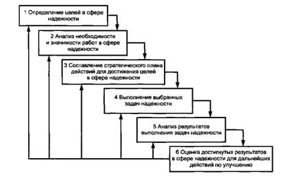3.19 жизненный цикл (life cycle): Период времени от этапа концепции до этапа распоряжения продукцией. 4 Система менеджмента надежностиСистема менеджмента надежности является частью общей системы менеджмента организации. Она обеспечивает организационную структуру для стратегического управления политикой в сфере надежности, контроля функций надежности и координации всех действий в сфере надежности. Тщательная разработка планов надежности и распределение соответствующих ресурсов на ранних этапах создания продукции помогает распределить усилия для достижения поставленных целей в сфере надежности. Для обеспечения надежности продукции необходимо проводить разработку и верификацию безотказности и ремонтопригодности продукции на различных этапах процесса ее создания. Для поддерживания надежности при использовании продукции должно быть обеспечено ее соответствующее техническое обслуживание. Для достижения целей организации в бизнесе, включая удовлетворенность потребителей, система менеджмента надежности должна обеспечить структуру жизненного цикла продукции и выполнение соответствующих программ надежности (см. 3.3, примечание 2). Жизненный цикл продукции отражает непрерывный процесс от начала создания продукции до прекращения ее использования. Процесс жизненного цикла формирует структуру соответствующих элементов и задач программы надежности. Этапы процесса менеджмента надежности, приведенные в ГОСТ Р 51901.1, включают в себя: - определение целей в сфере надежности; - анализ необходимости и значимости работ в сфере надежности; - составление стратегического плана действий для достижения поставленных целей в сфере надежности; - выполнение выбранных задач надежности; - анализ результатов выполнения задач надежности; - оценку достигнутых результатов в сфере надежности для дальнейших действий по улучшению. Этапы процесса менеджмента надежности изображены на рисунке 1. Стандарты менеджмента надежности, связанные с каждым этапом процесса, указаны в приложении D.