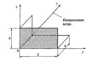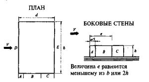 где k - принимается по таблице 6.2; b - ширина покрытия, принимаемая не более 100 м. Для покрытий с уклонами от 12 до 20% однопролетных и многопролетных зданий без фонарей, проектируемых в районах с V³4 м/с (см. схемы на рисунках Б.1 и Б.5 приложением Б), следует установить коэффициент сноса снега се=0,85 (5.3) Наличие зенитных фонарей и отдельных надстроек высотой стенки не более 0,4 м допускается не учитывать. Средняя скорость ветра V за три наиболее холодных месяца принимается по карте 2 приложения Ж. Для купольных сферических и конических покрытий зданий на круглом плане, регламентируемых схемами на рисунках Б.13, Б.14 приложения Б.13, при задании равномерно распределенной снеговой нагрузки значения коэффициента се следует устанавливать в зависимости от диаметра d основания купола се=0,85 при d£60 м; се=1,0 при d>100 м; се=0,85+0,00375(d-60) - в промежуточных случаях. Снижение снеговой нагрузки, предусматриваемое настоящим пунктом, не распространяется: а) на покрытия зданий в районах со среднемесячной температурой воздуха в январе выше минус 5°С (см. карту 5 приложения Ж); б) на покрытия зданий, защищенных от прямого воздействия ветра соседними более высокими зданиями, удаленными менее чем на 10h1, где h1 - разность высот соседнего и проектируемого зданий; в) на участки покрытий длиной b, b1 и b2, у перепадов высот зданий и парапетов (см. схемы на рисунках Б.8.1-Б.11 приложения Б). В остальных случаях, не указанных настоящим пунктом, следует принимать се=1,0. (5.4) 5.6 При определении снеговых нагрузок для неутепленных покрытий зданий с повышенными тепловыделениями при уклонах кровли свыше 3% и обеспечении надлежащего отвода талой воды следует вводить термический коэффициент сt=0,8. (5.5) В остальных случаях сt=1,0. (5.6) 5.7 Для районов со средней температурой января минус 5°С и ниже (по карте 5 приложения Ж) пониженное нормативное значение снеговой нагрузки (см. п. 1.1.2) определяется умножением ее нормативного значения на коэффициент 0,7. Для районов со средней температурой января выше минус 5°С пониженное значение снеговой нагрузки принимается равным ее нормативному значению. 5.8 Коэффициент надежности по снеговой нагрузке γf следует принимать равным 1,4. 6 Воздействия ветраДля зданий и сооружений необходимо учитывать следующие воздействия ветра: а) расчетную ветровую нагрузку; б) пиковые значения расчетной ветровой нагрузки, действующие на конструктивные элементы ограждения и элементы их крепления; в) резонансное вихревое возбуждение; г) аэродинамические неустойчивые колебания типа галопирования, дивергенции и флаттера (см. также раздел 9). Резонансное вихревое возбуждение и аэродинамические неустойчивые колебания типа галопирования необходимо учитывать для зданий и сплошностенчатых сооружений, у которых h/d>10, где h - высота, d - характерный поперечный размер. 6.1 Расчетная ветровая нагрузка6.1.1 Нормативную ветровую нагрузку w следует задавать в одном из двух вариантов. В первом случае нагрузка w представляет собой совокупность: а) нормального давления we, приложенного к внешней поверхности сооружения или элемента; б) сил трения wf, направленных по касательной к внешней поверхности и отнесенных к площади ее горизонтальной (для шедовых или волнистых покрытий, покрытий с фонарями) или вертикальной проекции (для стен с лоджиями и подобных конструкций); в) нормального давления wi, приложенного к вн