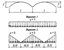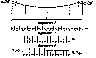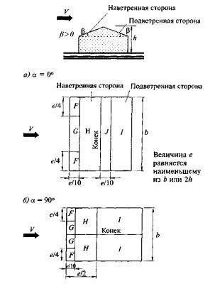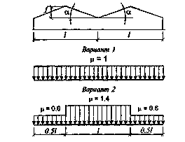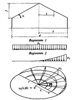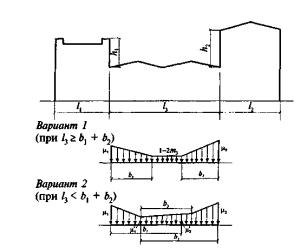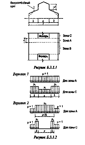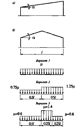 б) варианты 2 и 3 следует учитывать для зданий с двускатными покрытиями (профиль б), при этом вариант 2 - при 20°£α£40°; вариант 3 - при 10°£α£30° только при наличии ходовых мостиков или аэрационных устройств по коньку покрытия.