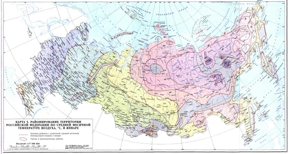Районирование территории Российской Федерации по средней месячной температуре воздуха, °С, в январе