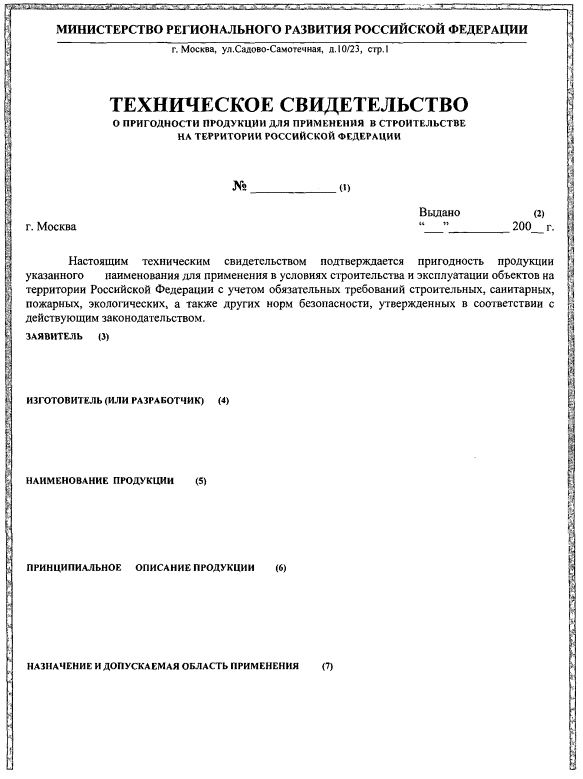 Приложение N 2к приказу Министерства регионального развития РФ от 13 октября 2008 г. N 208 Описание заполнения бланка технического свидетельства, выдаваемого Министерством регионального развития Российской ФедерацииВ техническом свидетельстве, выдаваемом Министерством регионального развития Российской Федерации, указывается: наименование органа, выдавшего техническое свидетельство - Министерство регионального развития Российской Федерации; его почтовый адрес; полное наименование документа - Техническое свидетельство о пригодности продукции для применения в строительстве на территории Российской Федерации; позиция (1) - номер технического свидетельства; позиция (2) - дата выдачи технического свидетельства; позиция (3) - полное или сокращенное (в случае, если имеется), в том числе фирменное наименование и организационно-правовая форма юридического лица (Ф.И.О. индивидуального предпринимателя, данные документа, удостоверяющего его личность), подавшего заявку на получение технического свидетельства, адрес, тел/факс, e-mail; позиция (4) - полное или сокращенное (в случае, если имеется), в том числе фирменное наименование, и организационно-правовая форма юридического лица (Ф.И.О. индивидуального предпринимателя, данные документа, удостоверяющего его личность) изготовителя (или разработчика) продукции, адрес, тел/факс, e-mail; позиция (5) - полное наименование продукции, на которую выдано техническое свидетельство; позиция (6) - принципиальное описание продукции; позиция (7) - назначение и допускаемая область применения продукции; позиция (8) - показатели и параметры, характеризующие надежность и безопасность продукции; позиция (9) - дополнительные условия производства, применения и содержания продукции, а также контроля качества, в том числе со стороны органов контроля и надзора; позиция (10) - перечень документов (заключения, акты экспертизы, отчеты по испытаниям и т.п.), использованных при подготовке технического свидетельства. позиция (11) - заключение федерального государственного учреждения "Федеральный центр технической оценки продукции в строительстве"; позиция (12) - дата окончания срока действия технического свидетельства; позиция (13) - должность, подпись, фамилия и инициалы уполномоченного лица; позиция (14) - печать Минрегиона России; позиция (15) - "Настоящее техническое свидетельство заменяет ранее действовавшее техническое свидетельство...", номер и дата выдачи заменяемого технического свидетельства; позиция (16) - "Пригодность продукции указанного наименования впервые была подтверждена соответствующим техническим свидетельством...", номер и дата его выдачи. В правом нижнем углу - порядковый номер бланка выдаваемого технического свидетельства.