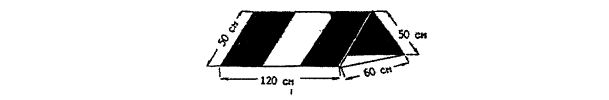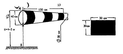 Рис. 1. Размеры пирамиды для обозначения границ вертолетной площадки 2. Границы площадки в условиях ограниченной видимости и ночью, обозначают фонарями красного или желтого цвета, которые устанавливают рядом с пирамидами. 3. Обозначают место приземления вертолета флажками (рис. 2), устанавливаемым по углам рабочей части вертолетной площадки: белого цвета - летом, черного или красного цвета - зимой. Стержни флажков целесообразно делать из металла. Ночью на месте флажков устанавливают фонари белого цвета. 4. Для определения направления ветра экипажем вертолета при посадке и взлете устанавливают на расстоянии не менее 50 м от границы вертолетной площадки на металлическом шесте высотой 4-5 м ветроуказатель (усеченный конус) из материала, на котором чередуются полосы черного и белого цвета. Конус крепится к шесту таким образом, чтобы он в зависимости от направления ветра мог бы свободно вращаться по оси А-Б (рис. 2).