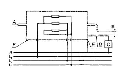 А - входное отверстие для воды; В - выходное отверстие для воды, С - схема цепи для измерения тока утечки по ГОСТ Р 52161.1 (рисунок1а), D - металлическая сетка, Е - зажим заземления, F - корпус водонагревателя Рисунок 102 - Схема измерения тока утечки для трехфазных водонагревателей с открытым элементом Для водонагревателей с открытым элементом, предназначенных для подсоединения к сети питания посредством шнура с вилкой, испытание на ток утечки повторяют. В течение этого испытания ток утечки измеряют между зажимом заземления прибора и нейтральным проводником, как показано на рисунке 103. Ток утечки, измеренный с селективным переключателем в каждой позиции, не должен превышать 2,75 мА.