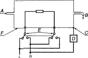 А - входное отверстие для воды; В - выходное отверстие для воды, С - зажим заземления; D миллиметр с низким импедансом сетка, Е - селективный переключатель, F - корпус водонагревателя Рисунок 103 - Схема измерения тока утечки для однофазных водонагревателей с открытым элементом, подключаемые посредством шнура питания с вилкой 14 Динамические перегрузки по напряжениюЭтот раздел части 1 применяют. 15 ВлагостойкостьЭтот раздел части 1 применяют, за исключением следующего. 15.1.2 Дополнение Настенные приборы устанавливают на расстоянии 3 мм от поверхности монтажа, если в инструкциях по установке не указано большего значения. 16 Ток утечки и электрическая прочностьЭтот раздел части 1 применяют, за исключением следующего. Водонагреватели с открытым элементом испытывают с использованием воды, имеющей удельное сопротивление, указанное в маркировке на приборе. 17 Защита от перегрузки трансформаторов и соединенных с ними цепейЭтот раздел части 1 применяют. 18 ИзносостойкостьЭтот раздел части 1 не применяют, 19 Ненормальная работаЭтот раздел части 1 применяют, за исключением следующего. 19.2 Не применяют. 19.3 Не применяют. 19.4 Дополнение Для водонагревателей с открытым выходом поточные выключатели и выключатели давления, которые работают при испытании по разделу 11., замыкают накоротко, вентиль регулирования потока воды устанавливают в наиболее неблагоприятное положение. Примечание 101 - Закрытое положение вентиля может быть наиболее неблагоприятным. Поточные выключатели закрытых водонагревателей замыкают накоротко, любые устройства ограничения давления приводят в нерабочее состояние, выходной вентиль закрывают. Однако, если в приборе нет поточного выключателя и происходит обратный сифонный эффект, то водонагреватель заполняют водой в количестве, достаточном только для покрытия нагревательного элемента; прибор работает с открытым выходным вентилем. Примечание 102 - Считается, что обратный сифонный эффект не возникает, если прибор оснащен обратным клапаном или прерывателем трубы или если в инструкциях указано, что при установке прибора необходимо подключить обратный клапан. 19.13 Дополнение Примечание 101 - Водяной резервуар считают кожухом. В течение испытания по 19.4 резервуар не должен разрываться и температура воды не должна превышать: - 99 °С - для водонагревателей с открытым выходом вместимостью свыше 1 л; - 140 °С - для закрытых водонагревателей вместимостью свыше 1 л. 20 Устойчивость и механические опасностиЭтот раздел части 1 применяют. 21 Механическая прочностьЭтот раздел части 1 применяют. 22 КонструкцияЭтот раздел части 1 применяют, за исключением следующего. 22.6 Дополнение Кожух прибора должен иметь дренажное отверстие, расположенное так, чтобы вода могла вытекать, не повреждая электрическую изоляцию, за исключением случаев, когда конденсированная вода не может накапливаться внутри кожуха при нормальной эксплуатации. Отверстие должно быть не менее 5 мм в диаметре или площадью 20 мм2 при ширине не менее 3 мм. Соответствие требованию проверяют осмотром и измерением. 22.23 Дополнение Требование не применяется для водонагревателей с открытым элементом. 22.101 Номинальное давление в закрытых водонагревателях должно быть не менее 0,6 МПа. Номинальное давление в закрытых водонагревателях, предназначенных для подключения к источнику водоснабжения ч