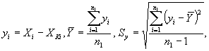 где {Xi, i = 1,..., n1} - результаты определений i-й рабочей пробы, получаемые по проверяемой методике; {Хкi, i = 1,..., n1} - результаты определений i-й рабочей пробы, получаемые по контрольной методике; yi - разность результатов анализа i-й пробы, полученных по проверяемой и по контрольной методике;