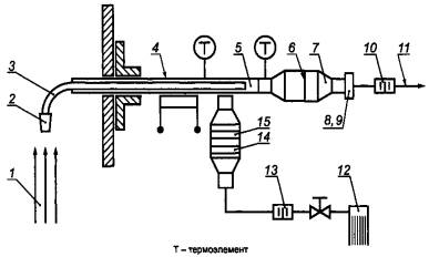 1 - насадка; 2 - зонд (равномерно подогреваемый); 3 - термостат с регулируемой температурой (температура не более 125°С); 4 - фильтродержатель; 5 - фильтр (диаметром