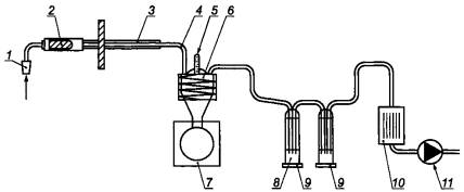 1 - насадка; 2 - держатель с фильтром; 3 - подогреваемый зонд; 4 - соединения (стеклянные); 5 - средство измерений температуры; 6 - холодильник; 7 - колба для сбора конденсата; 8 - диэтиленгликоль; 9 - барботер; 10 - осушительная колонна; 11 - побудитель расхода (насос, клапан, газовый счетчик)