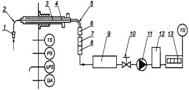 1 - насадка; 2 - коленчатое соединение; 3 - вставная стеклянная трубка; 4 - охлаждаемая пробоотборная трубка; 5 - стеклянное соединение; 6 - колба для сбора конденсата; 7 - фильтр из кварцевого волокна; 8 - картридж с XAD-2; 9 - холодильник для измеряемого газа; 10 - регулирующий клапан; 11 - насос; 12 - осушительная колонна с силикагелем; 13 - газовый счетчик; TG - средство для измерения температуры в газовом счетчике; TS - средство для измерения температуры в газоходе; PS - средство для измерения давления в газоходе; ∆PS - средство для измерения равновесного давления в газоходе (динамического); GA - газоанализатор отходящего газа (СO2 + О2)