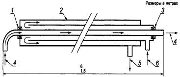 1 - прокладка; 2 - титановый корпус; 3 - прокладка; 4 - отбираемый газ; 5 - линия выпуска охлаждающей жидкости; 6 - линия ввода охлаждающей жидкости