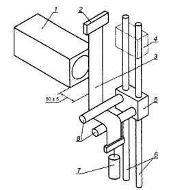 4 Методы проведения испытаний4.1 Подготовка образца к требуемым условиям, применимая к обоим методам испытаний 4.1.1 Предварительная обработка Предварительная обработка испытуемого образца осуществляется в соответствии со стандартом для данного типа одежды, в других случаях образец подвергается пяти стиркам или сухим химическим чисткам в соответствии с ЕН 340. Примечание - Предварительная обработка не требуется для защитной одежды, чистка которой в процессе эксплуатации не подразумевается (например, для защитной одежды разового использования). 4.1.2 Окружающая среда для приведения к требуемым условиям и проведения испытаний Если не указано иное, испытуемые образцы должны быть выдержаны в атмосферной среде при температуре (23 ± 1) °С и относительной влажности (25 ± 5) % в течение не менее 24 ч. 4.2 Трибоэлектрическое накопление заряда (метод испытания № 1) 4.2.1 Сущность метода Заряд в испытуемых материалах создается путем трения о цилиндрические стержни, установленные на вертикально движущемся ползуне. Напряженность электрического поля от заряда, созданного на испытуемом материале, наблюдается и регистрируется с помощью измерителя напряженности электрического поля, подключенного к прибору графического изображения результатов. 4.2.2 Оборудование 4.2.2.1 Общие сведения Испытательная аппаратура показана на рисунке 2. 4.2.2.2 Цилиндрические стержни Используют два стержня длиной (100 ± 5) мм с диаметром поперечного сечения (15,0 ± 0,5) мм. Стержни прикреплены к металлическому ползуну параллельно, без возможности свободного вращения так, чтобы нижняя часть первого стержня располагалась горизонтально на одной оси с верхней частью второго стержня, при этом расстояние между их ближайшими краями составляло (15 ± 1) мм (см. рисунок 1). Требуются две пары стержней, одна из которых изготовлена из полиэтилена высокой плотности (ПЭВП), а другая пара - из алюминия. Зажимное приспособление, используемое для крепления стержней к ползуну, должно позволять выполнять замену стержней. Стержни из ПЭВП должны иметь удельную массу (999 ± 10) кг/м3 и твердость по Шору D 63; поверхностное сопротивление - не более 106 Ом и объемное сопротивление - не более 106 Ом·см. Для алюминиевых стержней используют материал: AlMgSi (3.3207:6060). Аналогичные материалы допускается использовать, если они обеспечивают получение таких же результатов. Примечание - Производитель материала ПЭВП (РЕ-EL): SIMONA AG, D-55606 Kirn. Данную информацию приводят для удобства пользователей. 4.2.2.3 Ползун и опорная конструкция Ползун, к которому прикреплены цилиндрические стержни, перемещается по одной или более вертикальным направляющим. Исходным положением ползуна является наивысшая точка направляющей. Допускается либо свободное падение ползуна под тяжестью собственной массы, либо перемещение по направляющей(им) с использованием соответствующего электропривода. В первом случае требуется соответствующий зажим для фиксации ползуна в исходном положении перед выполнением каждого измерения. Ползун, направляющая(ие) и опорная конструкция могут иметь любое конструктивное исполнение, при котором цилиндрические стержни перемещались на скорости (0,20 ± 0,02) м/с в вертикальном направлении без существенного кручения или вращения. Все металлические конструкции должны быть заземлены. 4.2.2.4 Устройство для фиксации и натяжения образцов