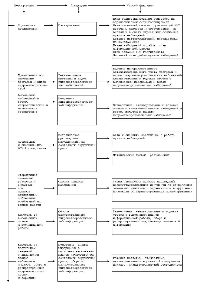 Схема выполнения административной процедуры ведения учета программ и видов гидрометеорологических наблюдений Приложение 5Структура наблюдательных сетей по видам наблюдений- авиаметеорологические; - агрометеорологические; - актинометрические; - аэрологические (радиозондирование); - воднобалансовые; - гелиогеофизические; - гидрологические на болотах; - гидрологические на реках и каналах; - гидрометеорологические на озерах и водохранилищах; - гляциологические; - ионосферные; - магнитные; - метеорологические; - метеорологические радиолокационные (МРЛ) - морские гидрометеорологические (в прибрежной зоне, в устьевой части рек, в открытой части, включая морскую судовую и экспедиционную сети); - селестоковые; - снеголавинные; - озонометрические; - теплобалансовые; - за атмосферным электричеством; - за испарением с поверхности воды, почвы, снега. Приложение 6Список