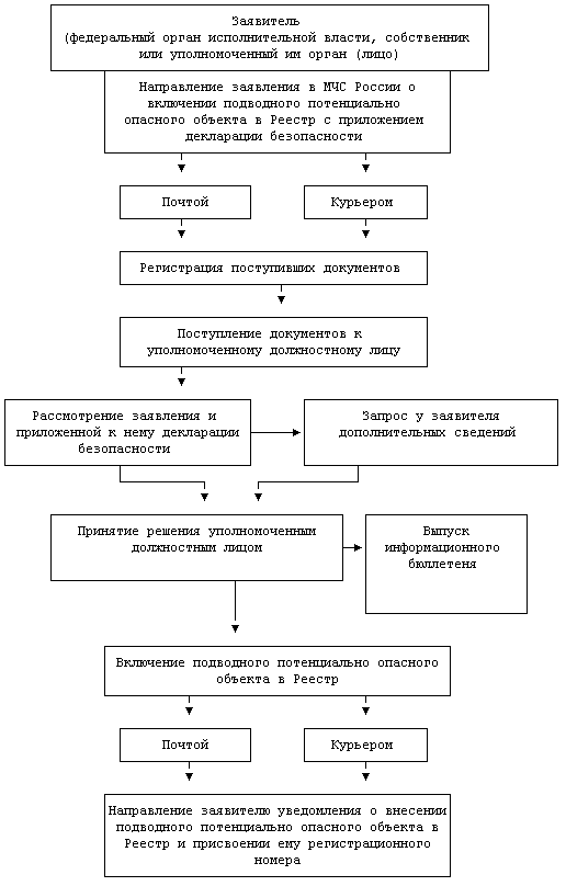 I. Общие положения1. Настоящий Административный регламент Министерства Российской Федерации по делам гражданской обороны, чрезвычайным ситуациям и ликвидации последствий стихийных бедствий (далее - МЧС России) по исполнению государственной функции по осуществлению ведения в установленном порядке реестра подводных потенциально опасных объектов во внутренних водах и территориальном море Российской Федерации (за исключением подводных переходов трубопроводного транспорта) определяет сроки и последовательность действий по исполнению государственной функции по осуществлению ведения в установленном порядке реестра подводных потенциально опасных объектов во внутренних водах и территориальном море Российской Федерации (за исключением подводных переходов трубопроводного транспорта) (далее - Реестр). 2. Исполнение государственной функции по ведению Реестра осуществляется в соответствии с: Указом Президента Российской Федерации от 11 июля 2004 г. N 868 "Вопросы Министерства Российской Федерации по делам гражданской обороны, чрезвычайным ситуациям и ликвидации последствий стихийных бедствий" (Собрание законодательства Российской Федерации, 2004, N 28, ст. 2882; 2005, N 43, ст. 4376; 2008, N 17, ст. 1814); постановлением Правительства Российской Федерации от 28 июня 2001 г. N 486 "О совершенствовании деятельности по предупреждению и ликвидации чрезвычайных ситуаций на подводных потенциально опасных объектах" (Собрание законодательства Российской Федерации, 2001, N 27, ст. 2770); постановлением Правительства Российской Федерации от 21 февраля 2002 г. N 124 "О декларировании безопасности подводных потенциально опасных объектов, находящихся во внутренних водах и территориальном море Российской Федерации" (Собрание законодательства Российской Федерации, 2002, N 8, ст. 849); приказом МЧС России от 27.02.2003 N 98 "Об утверждении Порядка разработки и представления декларации безопасности подводных потенциально опасных объектов, находящихся во внутренних водах и территориальном море Российской Федерации", зарегистрированным в Министерстве юстиции Российской Федерации 5 мая 2003 г., регистрационный N 4502 (Бюллетень нормативных актов федеральных органов исполнительной власти, 2003, N 33). 3. Федеральным органом исполнительной власти, исполняющим государственную функцию по осуществлению ведения в установленном порядке Реестра, является Министерство Российской Федерации по делам гражданской обороны, чрезвычайным ситуациям и ликвидации последствий стихийных бедствий. 4. Результатом исполнения государственной функции является организация ведения, изменения, дополнения и хранения записей Реестра, издание Реестровой книги, предоставление из Реестра информации заинтересованным лицам в целях: учета подводных потенциально опасных объектов; сбора, обработки и распространения информации о безопасности подводных потенциально опасных объектов; создания информационной основы для разработки и осуществления мероприятий по обеспечению безопасности подводных потенциально опасных объектов; информационного обеспечения государственного управления в области безопасности подводных потенциально опасных объектов. 5. В качестве заявителей по включению, внесению изменений и дополнений в Реестр, а также исключению информации из него выступают федеральные органы исполнительной власти и 