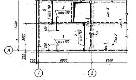 Черт. 11 6.2. При изображении каркаса или сетки одинаковые стержни, расположенные на равных расстояниях, наносят только по концам каркаса или сетки, а также в местах изменения шага стержней. При этом под полкой линии-выноски с обозначением позиции стержней указывают их шаг (черт. 12).