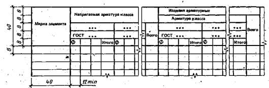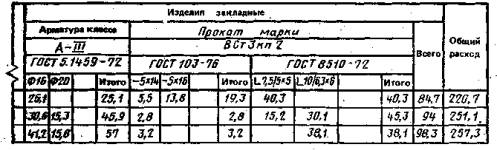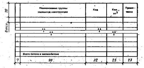 Черт. 2 2.4.6. Рабочие чертежи арматурных и закладных изделий, примененных в монолитных железобетонных конструкциях* комплектуют в соответствии с требованиями ГОСТ 2.102-68 и ГОСТ 21.101-79. Допускается чертежи на простые детали (например, отдельные стержни), непосредственно входящие в состав монолитной железобетонной конструкции, не выполнять, а все необходимые данные для их изготовления приводить в спецификации соответствующей конструкции и, при необходимости, помещать изображения этих деталей на чертеже монолитной железобетонной конструкции. При большом количестве деталей данные, необходимые для их изготовления, помещают в ведомости по форме 1. Пример заполнения ведомости приведен в справочном приложении 1. 2.5. Спецификации 2.5.1. Спецификации к схемам расположения элементов сборных конструкций составляют по ГОСТ 21.104-79. 2.5.2. Спецификацию монолитной железобетонной конструкции составляют по форме 2. Если монолитная железобетонная конструкция состоит из нескольких элементов, на каждый из которых выполняют отдельные схемы армирования, то спецификацию составляют по разделам на каждый элемент. Наименование каждого раздела указывают в виде заголовка в графе «Наименование» и подчеркивают. В наименования разделов включают марку элемента, принятую в рабочих чертежах, и через дефис - количество элементов на конструкцию (например, «Балки Бм 1 - шт. 2»). Каждый раздел в общем случае состоит из подразделов, которые располагают в следующей последовательности: сборочные единицы; детали; стандартные изделия; материалы. В подраздел «Сборочные единицы» записывают сборочные единицы, непосредственно входящие в элемент специфицируемой конструкции, в следующей последовательности: каркасы пространственные; каркасы плоские; сетки; изделия закладные. В подразделы «Материалы», записывают материалы, непосредственно входящие в специфицируемую конструкцию. Порядок заполнения граф спецификации принимают по ГОСТ 2.108-68 с учетом следующего дополнительного требования: в графе «Кол.» записывают общее количество составных частей (например, арматурных каркасов, сеток), входящих во все одноименные специфицируемые элементы. Пример заполнения спецификации монолитной железобетонной конструкции приведен в справочном приложении 2. 2.6. Ведомость объемов сборных бетонных и железобетонных конструкций составляют по форме 3. В графах ведомости указывают: в графе «Наименование группы элементов конструкции» - наименования групп одноименных элементов конструкций по Общесоюзному классификатору (например, блоки фундаментов, колонны, балки стропильные и подстропильные, балки подкрановые); в графе «Код» - кодовое обозначение групп элементов конструкции в соответствии с Общесоюзным классификатором (например, блокам фундаментов соответствует код 58 1103, колоннам - 58 2100); в графе «Кол., м3» - общий объем бетона и железобетона, необходимый для изготовления всех элементов, входящих в соответствующую группу; в графе «Примечание» - дополнительные сведения по записанным в ведомости бетону и железобетону. В конце ведомости приводят следующую запись: «Материалы на изготовление сборных бетонных и железобетонных конструкций учтены в ведомости потребности в материалах и отдельно не учитываются». 2.7. Ведомость расхода стали на элемент монолитной железобетонной конструкции с