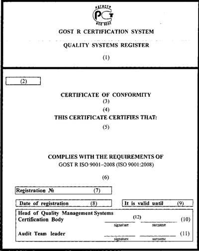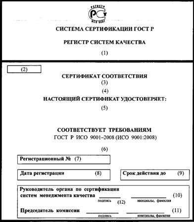 Прямоугольные поля на формате сертификата соответствия СМК (далее - сертификат), обозначенные цифрами в скобках, носят условный характер и должны содержать следующие данные: