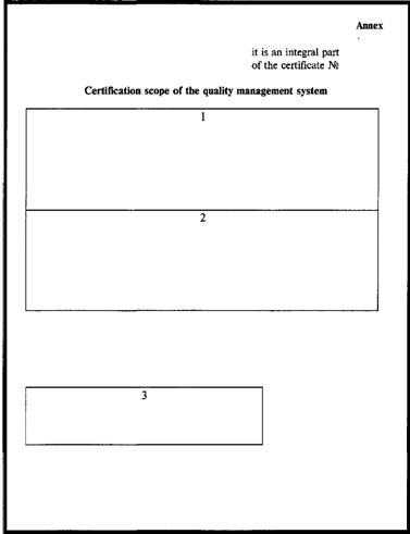 Если приложение к сертификату не оформляют, в данном поле делают запись: «Разъяснения, касающиеся области сертификации СМК, могут быть получены путем консультаций с ...» (указывают наименование организации - держателя настоящего сертификата;