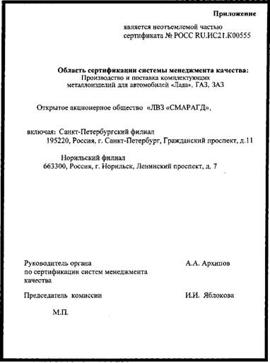 Содержание приложения к сертификату соответствия системы менеджмента качества